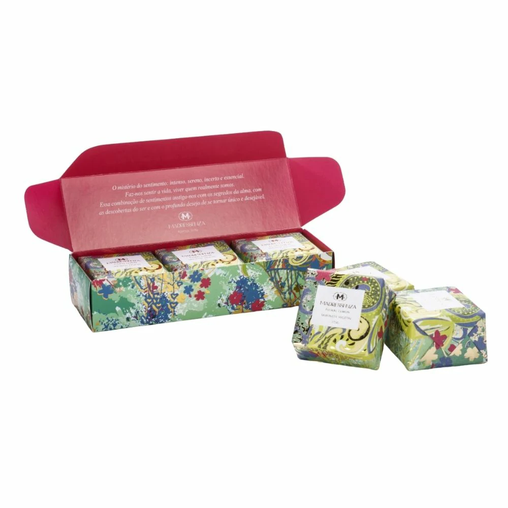 O estojo de sabonetes Floral Lemon possui perfume discreto exótico e suave, estimula os sentidos e proporciona vitalidade ao corpo e mente. Traz alegria, bom humor e otimismo. Espuma cremosa e duradoura. É produzido a partir de matéria prima vegetal, contém glicerina, manteiga de karité e amido vegetal que proporcionam um toque aveludado e sedoso. Em embalagem especial, contém 3 unidades de sabonete Floral Lemon de 115g cada, com belíssima ilustração cheia de detalhes e charme, uma ótima opção para presentear. Notas Olfativas: Aroma refrescante de floral frutado, com saída cítrica de limão e bergamota, possui corpo amadeirado de cedro, com toques de floral e fixação de sândalo e almíscar.